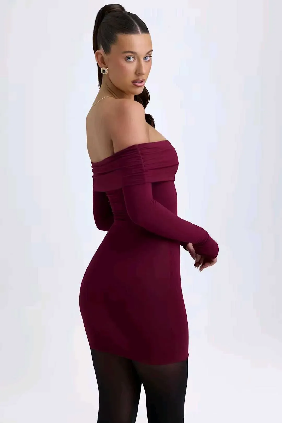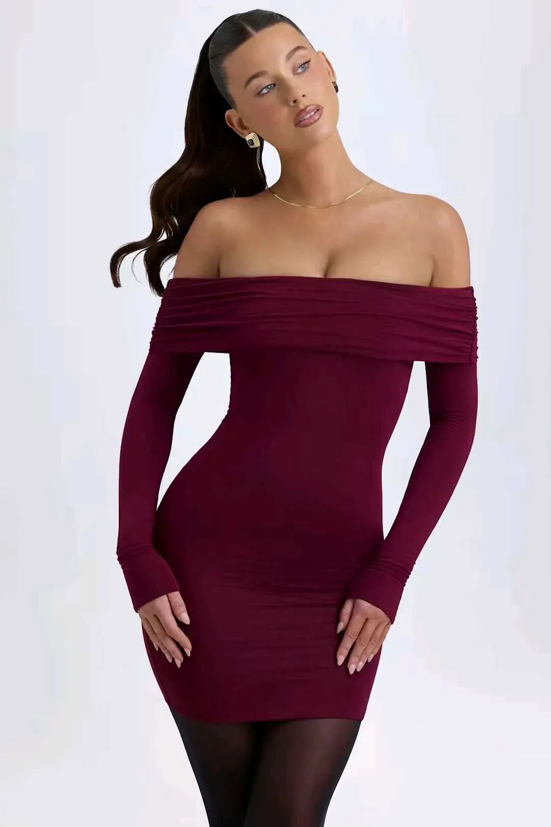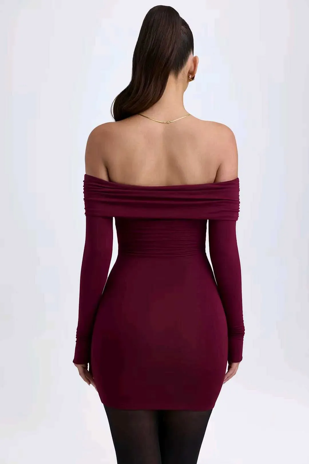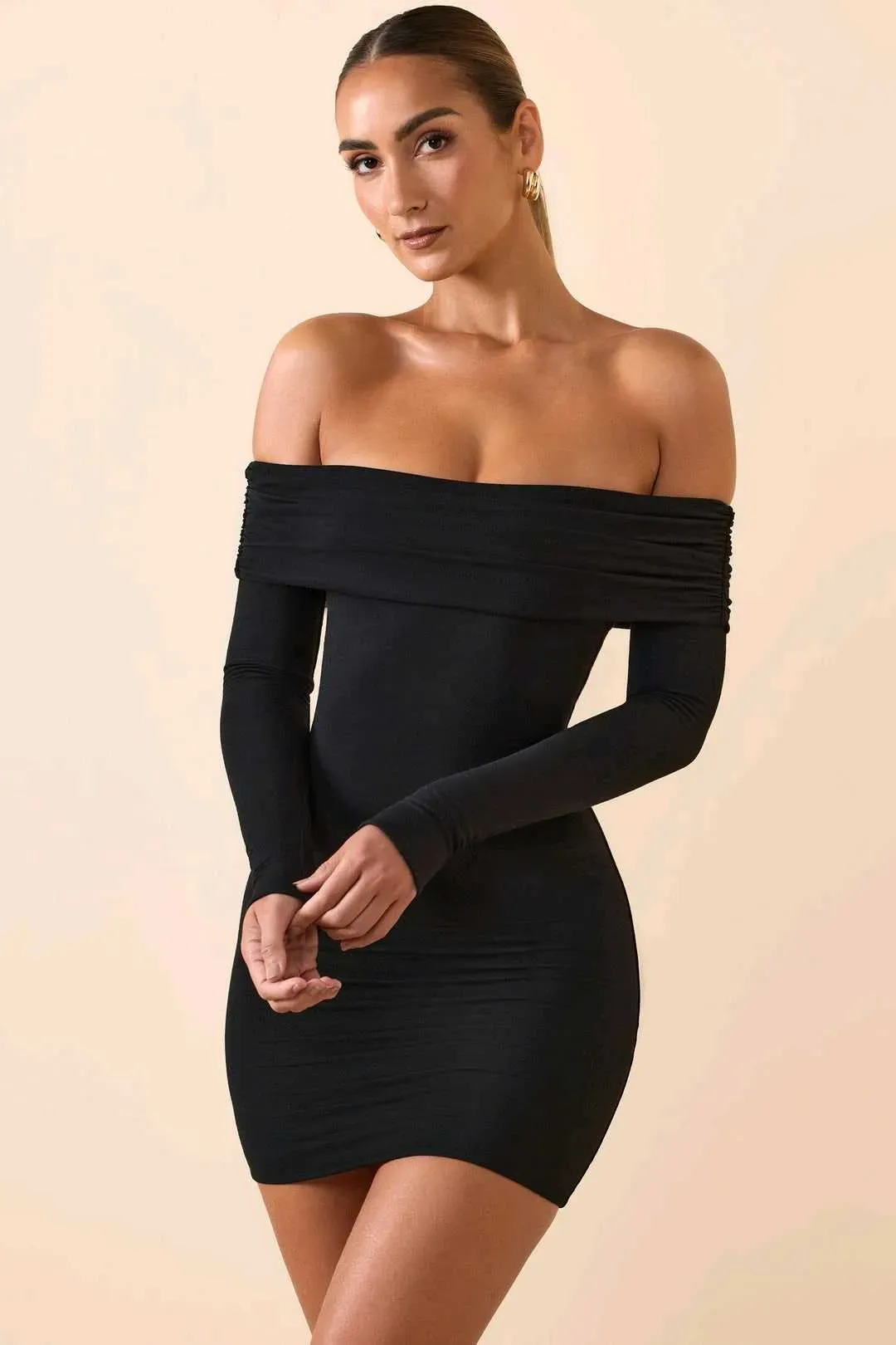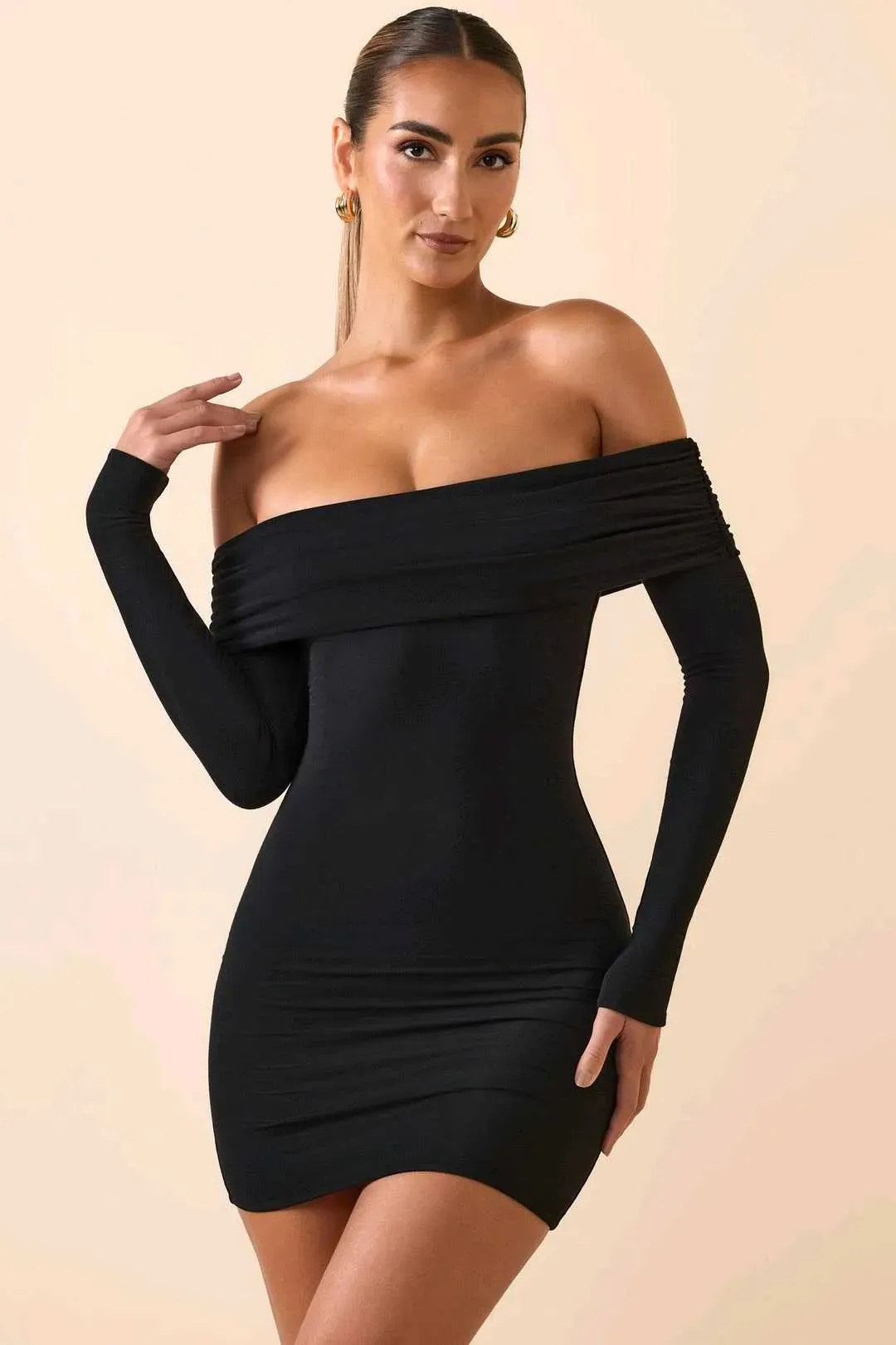 Prendas básicas que marcan tendencia. Un estilo ideal para el día y la noche, el minivestido Oriana presenta una silueta de hombros descubiertos y un escote fruncido. Incorpora una cinta de silicona interna para una mayor sujeción, mangas largas ajustadas y está confeccionado con nuestro jersey suav...